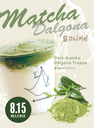1ヶ月毎に期間限定で変わるフラッペメニュー。8月の期間限定メニューは、韓国でも大人気の抹茶味。濃厚抹茶と甘いミルク氷のダルゴナ抹茶。混ぜるとまろやかな抹茶フラッペとなっています。