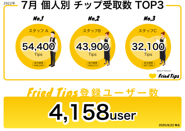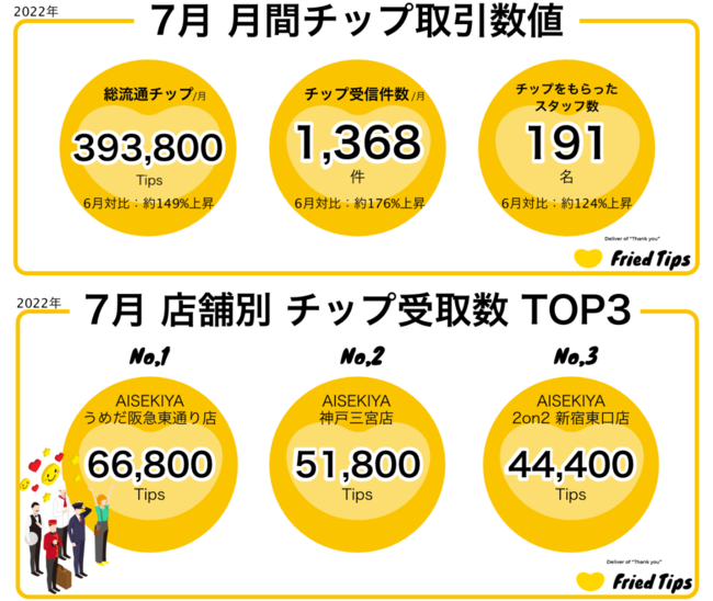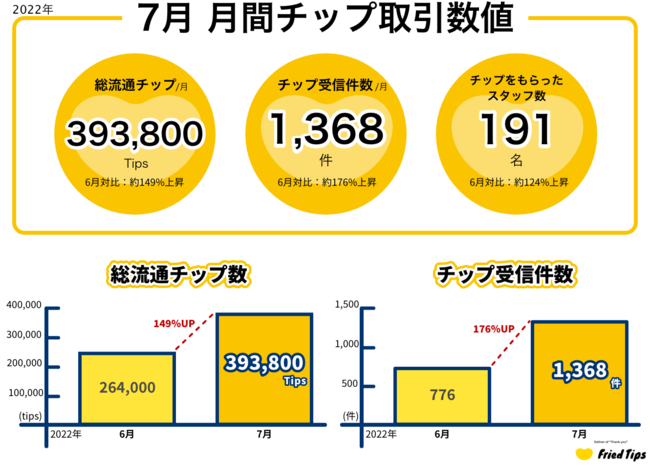 舗にて「チップの流通金額」「チップ受け渡しの回数」「チップを受け取ったスタッフの人数」「スタッフ個人の月額最高金額」「店舗別の流通チップ数」を7月1日~30日の結果を計測し2022年6月度の実績と比較致しました。