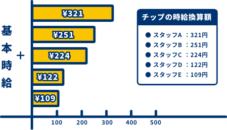 最も高いスタッフで時給換算額 321円となりました。東京都の「飲食サービス職」の平均時給が1,060円(※1)だとすると、チップ受取額を含めると1,381円相当の時給計算となる事がわかりました。