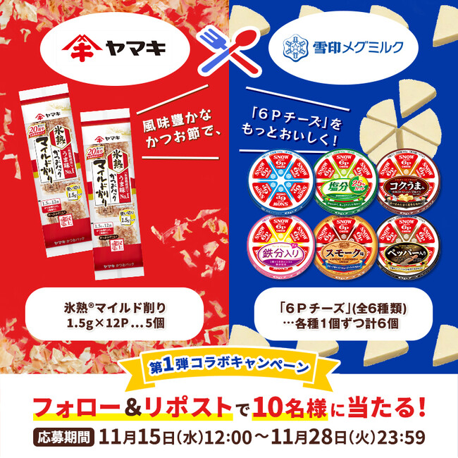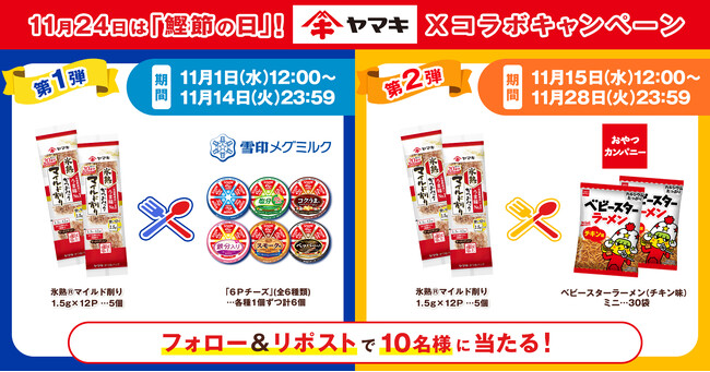 ヤマキ株式会社(本社:愛媛県伊予市 代表取締役社長:城戸善浩、以下 ヤマキ)は、かつお節の価値や魅力を広める活動「ヤマキ かつお節プラス(R)」の一環として、11月24日「鰹節の日」に向けて、11月1日(水)よりX(旧Twitter)コラボキャンペーンを実施します。2社とタッグを組み、かつお節と相性の良い商品とヤマキのかつお節商品をセットにしてプレゼントを行う企画です。第1弾は、雪印メグミルク株式会社(本社:東京都新宿区 代表取締役社長:佐藤雅俊、以下 雪印メグミルク(株))の「6Pチーズ」、第2弾は株式会社おやつカンパニー(本社:三重県津市 代表取締役社長:横山正志、以下 (株)おやつカンパニー)の「ベビースターラーメン」とコラボします。