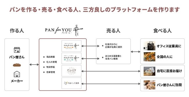 パンを売りたい事業者とパン屋さんをあらゆる形でつなぐプラットフォームで、2020年7月のサービス開始以降、展開商品数は400種類以上、取引企業数は100社以上です。全国のパン屋さんを通じたパンの商品開発サービス「パンフォーユーBiz OEM」・パン屋さんの手作りパンの仕入れサービス「パンフォーユーBiz セレクトショップ」・冷凍パンを活用したパン販売支援サービス「パンフォーユーBiz ゴーストベーカリー」「パンフォーユーBiz プロデュース」4つのサービスを軸に、EC・スーパーマーケット・飲食店・食品メーカー・イベントなど、様々なチャネルのニーズに合わせて、独自の冷凍技術とネットワークを活用し、商品選定・仕入れ管理・物流手配・店舗展開やアイデア商品の実現など、多様化する“パンビジネス”を包括的に支援します。