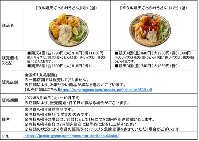 株式会社丸亀製麺(本社:東京都渋谷区、代表取締役社長:山口 寛)が展開する讃岐うどん専門店「丸亀製麺」は、『タル鶏天ぶっかけうどん』『辛(から)タル鶏天ぶっかけうどん』、『タル鶏うどん弁当』を2022年8月30日(火)から全国の丸亀製麺にて期間限定で販売いたします。