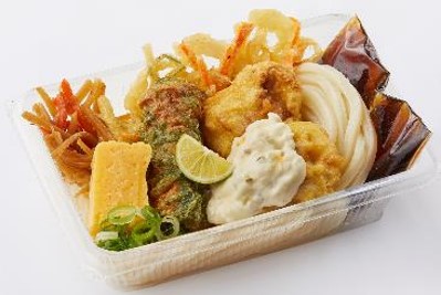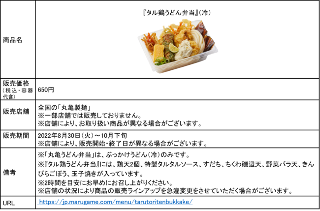 いつでもどこでも、打ち立て・茹でたてのうどんと天ぷらやおかずが手軽に楽しめる「丸亀うどん弁当」に、今秋はタル鶏もラインアップ。つるつる、もちもちのうどんにジューシーな鶏天2個と特製タルタルソース、定番おかず2種類と天ぷら2種類がひと箱に詰まり、バラエティ豊かな味わいに。