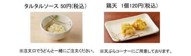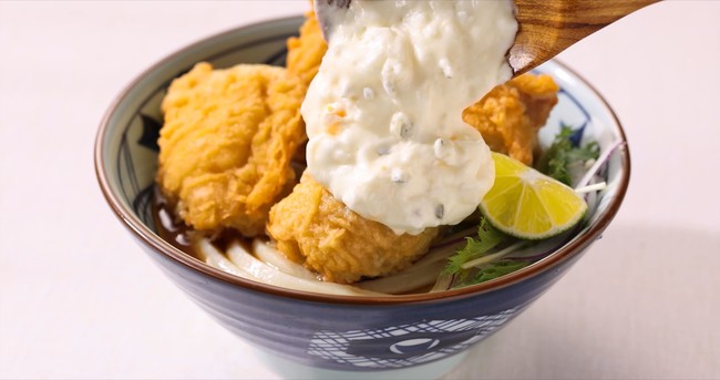 今年は、タルタルソースの濃厚な味わいをさらに楽しんでいただけるよう、たまねぎ、ゆで卵、ピクルスをバランス良くブレンド。さくさくの鶏天はもちろん、ぶっかけだしとの相性も抜群です。