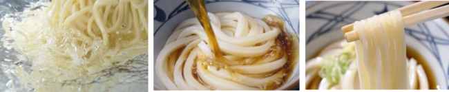 「おいしいうどん」は、徹底的に鮮度にこだわりぬいた「生きている」状態で提供されて初めて実現できる、と丸亀製麺は信じています。丸亀製麺がお届けするうどんは、国内 800 を超えるすべての店で一軒、一軒、手間を惜しまず、毎日、100%国産の小麦粉から打っています。打ち立てのうどんにこだわり、その場で切って、茹でて、作りたてをお客さまに提供しているからこそ、もちもちでおいしい独自の“丸亀食感”をお届けできています。