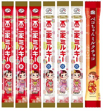 七五三定番の「千歳飴(赤)/(白)」は、それぞれ3種類の華やかな着物姿のペコちゃんデザインで登場。練乳と生クリームを使用し、不二家のロングセラーキャンディ「ミルキー」のような濃厚な味わいが楽しめます。千歳飴をイメージしたスティック型チョコ「ペコちゃんミルクチョコ」もございます。別売りの「千歳飴詰め合わせ袋(ペコポコ)」は2種類のサイズをご用意。お宮参りや記念撮影など、お子様の年齢に合わせてお使いいただけます。