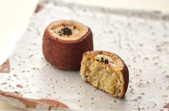 「なると金時」を使い、さつまいもの甘さと食感を活かした一品です。さつまいも餡を包んだ乳菓生地に桂皮末をまぶして焼き上げ、胡麻をあしらいました。