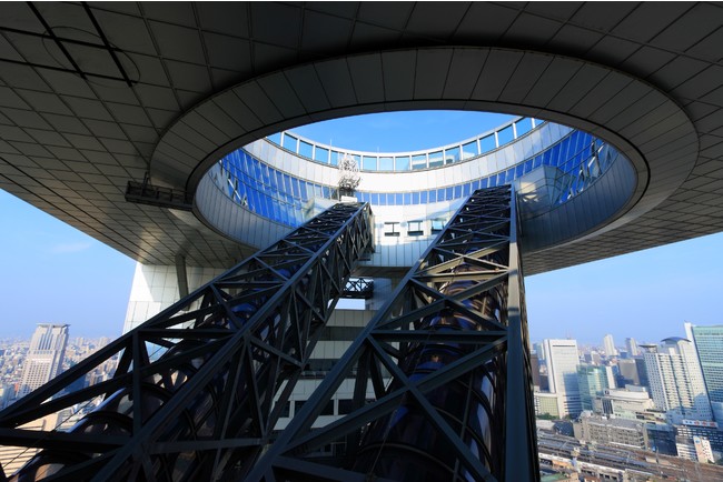 梅田スカイビルは、2つのビルが屋上を含む上層部「空中庭園」でつながる独特のフォルムの連結超高層ビル。