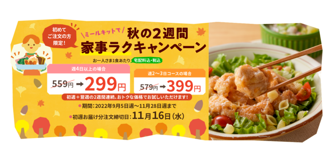 これから「PAKU MOGU」を始める方は、週4日以上のご注文でお1人さま1食あたり299円よりご注文できる「秋の2週間家事ラクキャンペーン」をご利用いただけます。初週+翌週の2週間連続、おトクな価格でお試しいただけますので、ぜひこの機会にご利用ください。