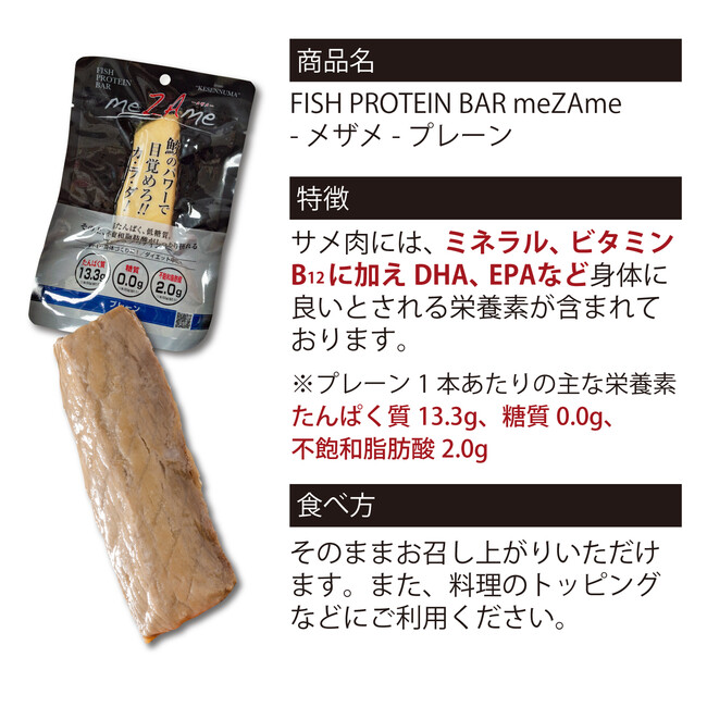 正式名称: 『FISH PROTEIN BAR meZAme -メザメ-』(プレーン、ブラックペッパー)