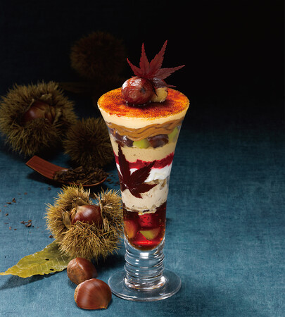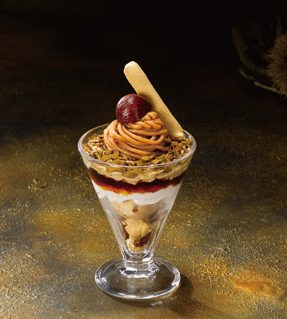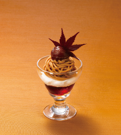 カリっとしたクレームブリュレに渋皮栗の甘さ、ほうじ茶のほろ苦さ、ピーカンナッツの香ばしさ、赤すぐりの甘ずっぱさが調和した秋を彩るパフェです。