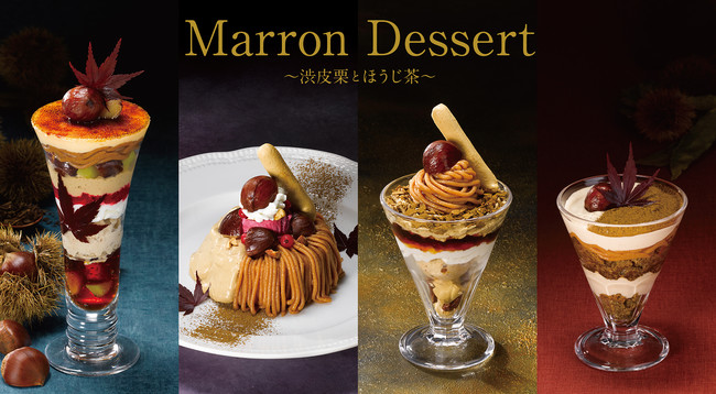 「渋皮栗とほうじ茶のブリュレパフェ」は、カリっとしたクレームブリュレに渋皮栗の甘さやほうじ茶のほろ苦さが調和した秋を彩る一品です。新登場の「渋皮栗とほうじ茶のティラミスパフェ」は、ほうじ茶と洋酒が香るシフォンケーキ、渋皮栗アイス、マロン風味のマスカルポーネクリームを重ねた大人向けのデザートに仕上げました。その他、シフォンケーキのモンブラン風プレートやモンブランパフェ、セットで楽しむプチデザートも提供します。