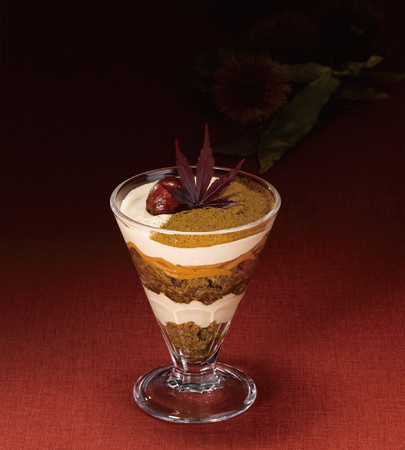 ほうじ茶と洋酒が香るシフォンケーキ、渋皮栗アイス、マロン風味のマスカルポーネクリームを重ねた香り高い和テイストのパフェです。