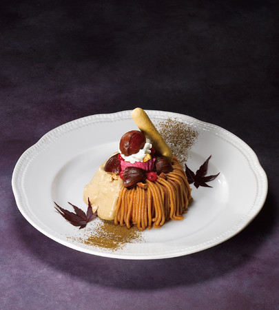 ふんわりシフォンケーキの上に濃厚なマロンクリームをモンブラン風に盛り付けて、ほろ苦いほうじ茶クリーム、甘ずっぱいカシスアイスと合わせました。アーモンドやほうじ茶メレンゲのサクサクとした食感も楽しい一品です。