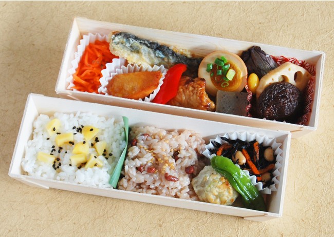 「秋香る重ね弁当」は、秋を代表する味覚である栗・秋刀魚・さつま芋・茄子など秋の彩りや香りに味わいを、一品一品手づくりで丁寧に仕上げました。一段目には、二種の彩りが食欲をそそる、ホクホクの栗が入ったご飯と、鮮やかな赤飯を盛り込み、二段目には、季節を感じる秋刀魚の竜田揚げや秋野菜、そして煮浸しなどを盛り込んでいます。
