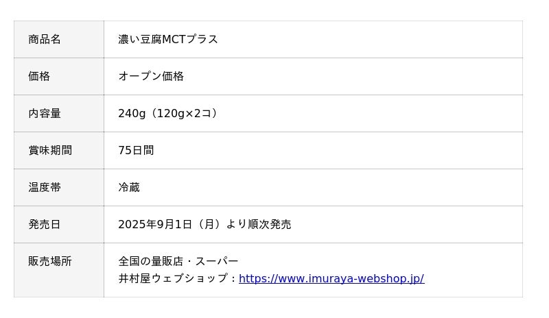 井村屋株式会社(本社:三重県津市高茶屋七丁目1番1号、社長:岩本 康)は、機能性表示食品『濃い豆腐MCTプラス』を2025年9月1日(月)から発売します。
