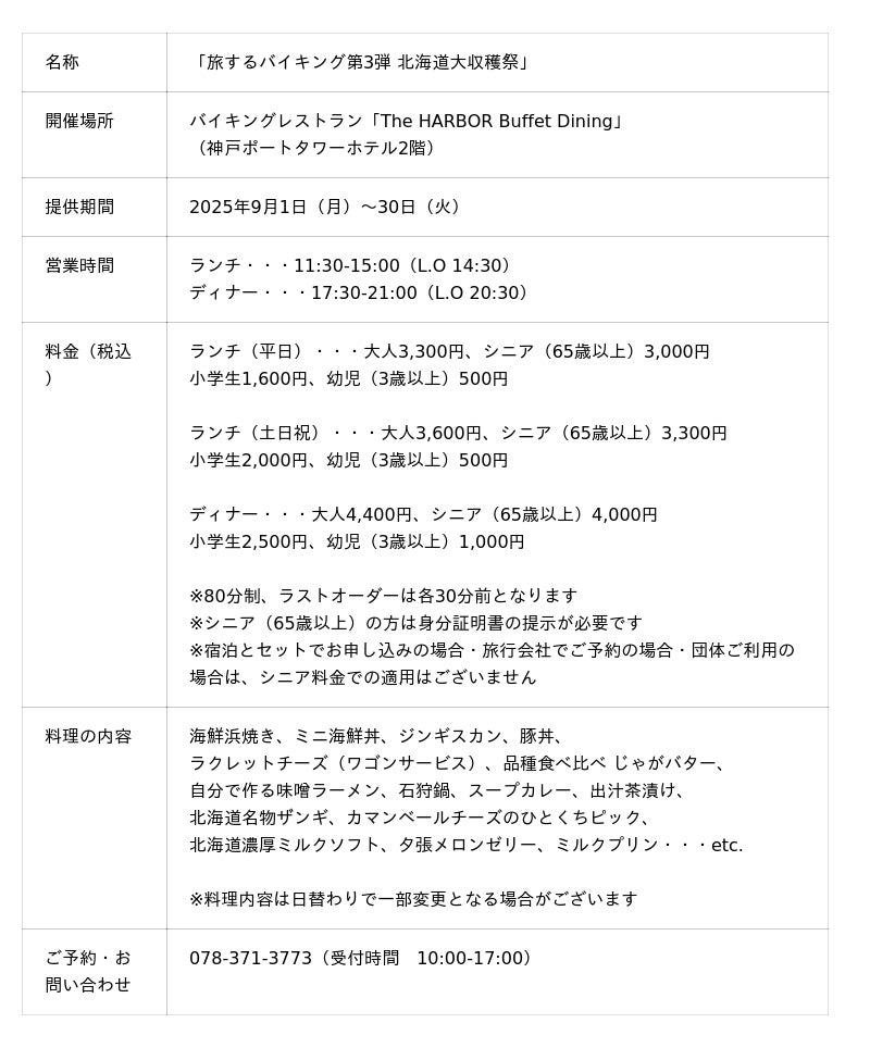 株式会社アベストコーポレーション(代表取締役:松山 みさお)が運営する神戸ポートタワーホテル(支配人:薩摩利幸、兵庫県神戸市中央区)は、バイキングレストラン「The HARBOR Buffet Dining(ザ・ハーバー ビュッフェダイニング)」で2025年9月1日(月)から30日(火)まで、「旅するバイキング第3弾 北海道大収穫祭」を開催します。