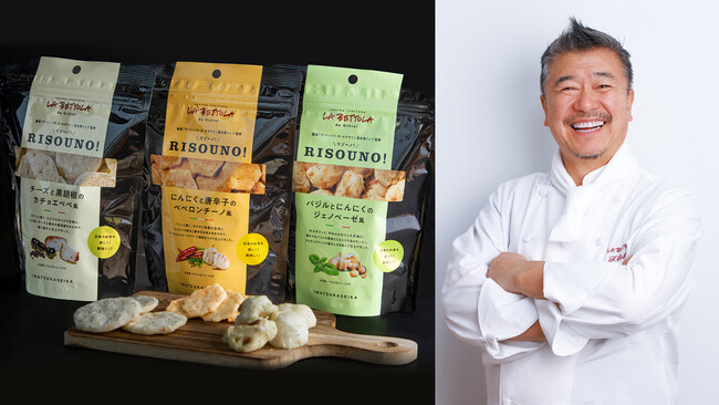 「ラ・ベットラ・ダ・オチアイ」落合務シェフが監修した米菓「RISOUNO!(リゾーノ)」3種セットをお土産にお持ち帰りいただけます。「日本のお米(RISO)を楽しく!美味しく!(BUONO!)」をコンセプトに、イタリア料理のような味わいを米菓で表現しました。ご自宅で、ボーノ!なひとときをお楽しみください。