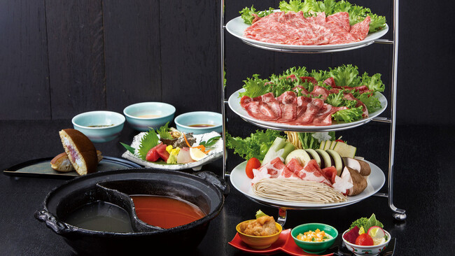 宮崎の美味しいお肉や春の野菜など、素材そのものの味を堪能するしゃぶしゃぶ。宮崎牛サーロインなどが美しく盛られた“肉タワー”の見た目もお楽しみください。
