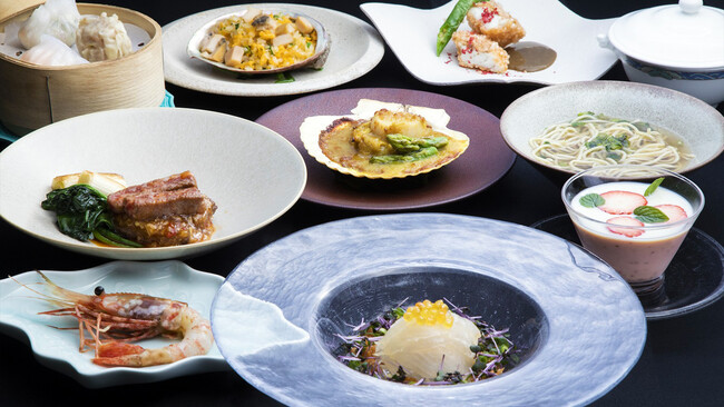 藍海のスペシャリテ「金の上湯スープ」をベースに仕上げた「ハマグリの上湯蒸しスープ」、ボタン海老の紹興酒漬けなど、旬の素材やこだわりの素材を多彩な調理法で、丁寧に美しく仕上げました。