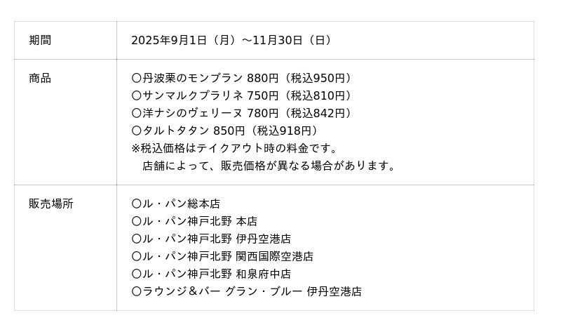 同フェアの商品は、ル・パン総本店、ル・パン神戸北野 本店、ル・パン神戸北野 伊丹空港店、ル・パン神戸北野 関西国際空港店、ル・パン神戸北野和泉府中店、ラウンジ&バー グラン・ブルー 伊丹空港店にてお買い求めいただけます。