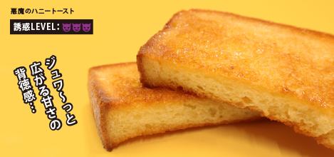 商品特徴:北海道産バターとはちみつをたっぷりと食パンに塗り、こんがり焼きあげた濃厚ハニートースト。かぐわしい香りと優しい甘さは、辛さで刺激されたお口にはたまりません!