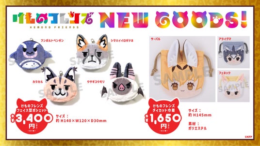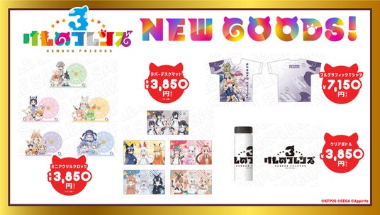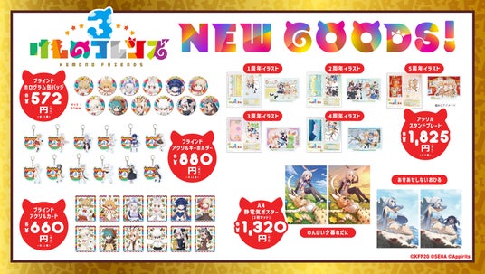 また、新グッズの追加情報が解禁。既に発表済みの「けものフレンズ×蛇窪神社」コラボ新グッズ、 1~5周年のイラストを使用したアクリルスタンドプレート等に加えて、デカアクリルスタンドやミニアクリルクロック、Tシャツ、クリアボトル等、新たなグッズがお目見え。