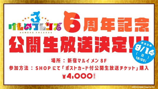 観覧希望の方へ、9月5日(金)AM11:00より新宿マルイ メン8Fイベントスペース「けものフレンズ 10th ANNIVERSARY SHOP SPECIAL」会場内で、数量限定の「ポストカード付公開生放送チケット」を販売する。