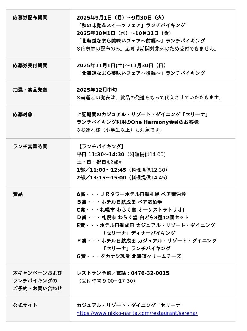 本キャンペーンは、対象期間中にカジュアル・リゾート・ダイニング「セリーナ」のランチバイキングを2回以上ご利用いただくことでご参加いただけるイベントです。応募券の配布は2025年9月1日(月)~10月31日(金)、2025年11月1日(土)~11月30日(日)のランチ利用時にその応募券をお持ちいただくと、12月に抽選で賞品が当たります。月替わりのランチバイキングを堪能しながら、賞品が当たるチャンスをお楽しみください。なお、本キャンペーンはOne Harmony会員のお客様(*)、と小学生以上のお連れ様を対象としています。