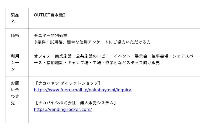 ナカバヤシ株式会社(本社:大阪市中央区、社長:中林一良)はキャッシュレス専用のロッカー型自販機「OUTLET自販機2」を8月初旬より新たに堺オフィス前に導入しました。