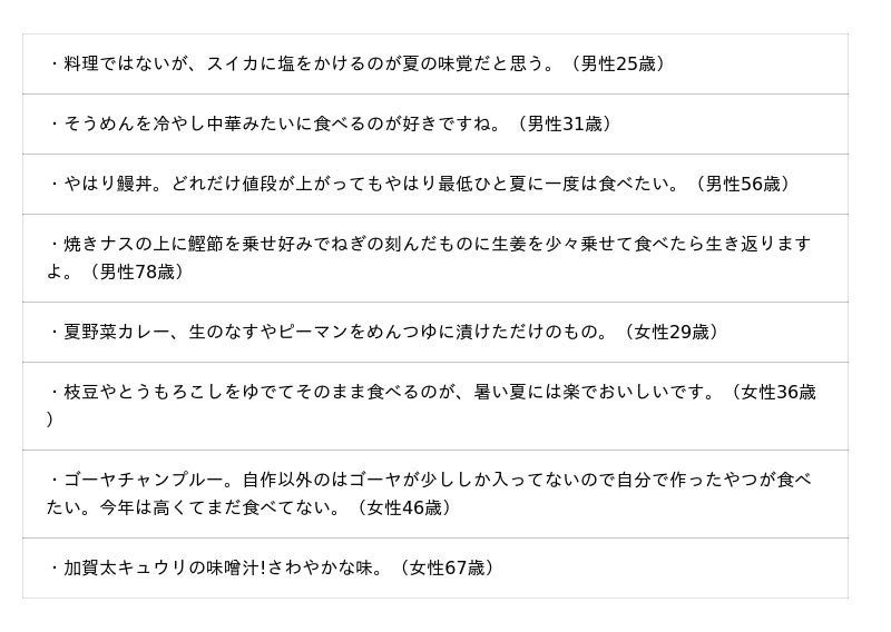 自分にとっての夏の味覚や味わう時の重視点、夏に飲みたくなる飲み物などについて聞いています。調査結果をお知らせいたします。