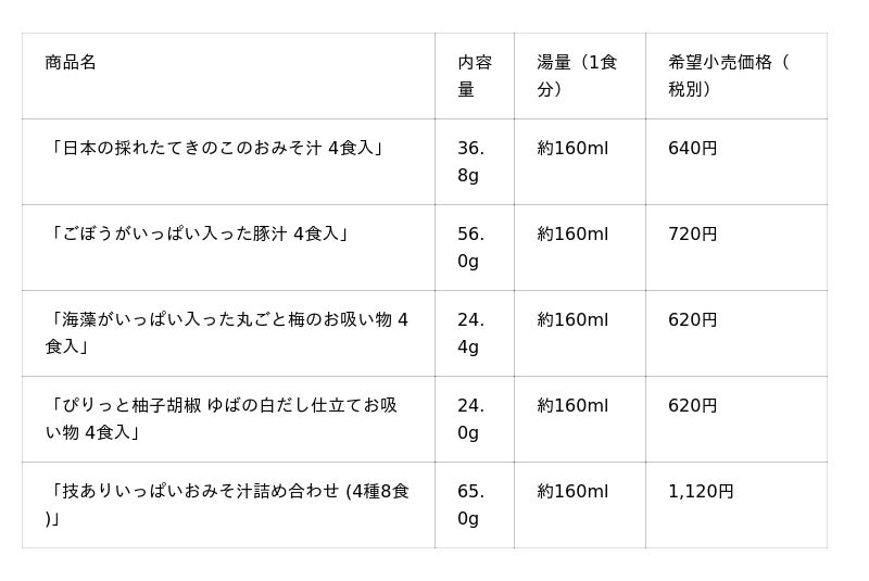 このたび発売となるのは、人気のおみそ汁〈きのこ・豚汁〉とお吸い物〈梅〉の1袋4食入り、さらに、お吸い物シリーズには国産大豆から作られた〈ゆば〉の4食入りが新登場。また、おみそ汁シリーズでは4食入りに加え、全国各地の味噌を独自にブレンドした“超合わせ味噌”仕立ての4種類〈あおさ、白ねぎ、海峡わかめ、ねばねば野菜〉を詰め合わせたアソートもご用意しました。毎日の食卓を彩る一杯としてはもちろん、大切な方への贈り物としてもお選びいただけるラインアップです。