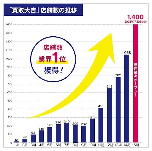 『買取大吉』はリユース品の買取専門店です。貴金属やブランド品、時計を中心に切手、古銭、骨董品、商品券、カメラなど、生き物、生もの以外は ほぼ何でも買い取るという取扱品目の幅広さが特徴です。小売は行わず、文字通り一般ユーザーからの買取りに特化しています。全国1,400店舗以上を展開し、リユース業界1位の店舗数に急成長いたしました。 これからも地域のコミュニティーセンターのように安心してご利用いただける買取専門店を目指してまいります。■企業概要
