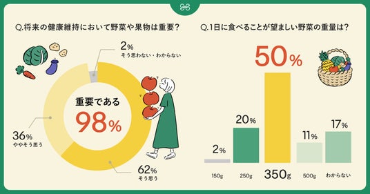 たっぷり野菜のヘルシーおうちごはん「GREEN SPOON(グリーンスプーン)」を企画・製造・販売する株式会社Greenspoon(本社:東京都渋谷区、代表取締役CEO:田邊友則)は、8月31日の「野菜の日」に際し、栄養学の専門家である林 芙美先生(女子栄養大学教授)監修のもと、GREEN SPOON利用経験のある全国の20代~60代の男女98名を対象に「野菜の摂取と食生活に関する意識調査」を実施しました。その結果、野菜や果物の重要性は理解されていながらも、実際の摂取量は推奨に届かず、“知識と行動のギャップ”が改めて浮き彫りになりました。