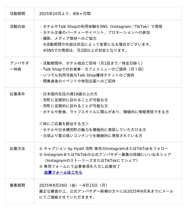 2025年10月7日(火)に東京初進出の開業を控えるハイアットブランドの「キャプション by Hyatt 兜町 東京」(東京都中央区、総支配人:山田 政和)は、日本橋兜町とホテルの魅力を一緒に発信してくださる公式アンバサダーを募集します。