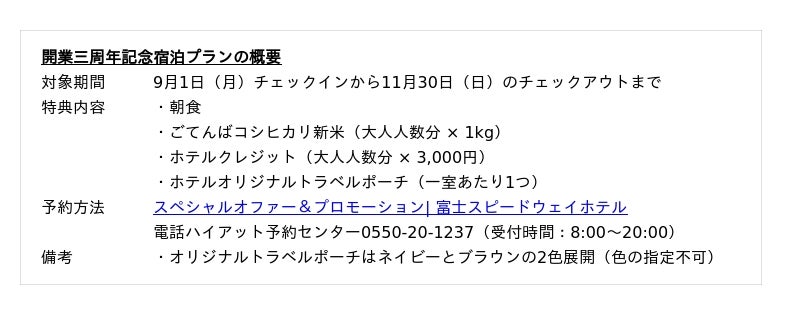 富士スピードウェイホテルは、2022年10月の開業から今年で3周年を迎えるにあたり、ご愛顧いただいた皆様へ感謝の気持ちを込めた「開業3周年記念プラン(朝食付き)」をご用意しました。3周年にちなみ、ご宿泊の皆さまへ3つの特典をプレゼントいたします。