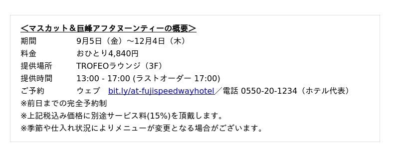 富士山の雄大な眺望を誇る「TROFEO ラウンジ」では、2025年9月5日(金)から12月4日(木)まで、秋の味覚・巨峰とマスカットを贅沢に使ったアフタヌーンティーを提供します。