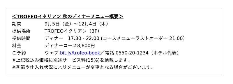 ハイアットブランド「アンバウンド コレクション by Hyatt」として、「静と動が共存」する唯一無二の環境のなか、お客様と共にここだけのストーリーを紡いでいる「富士スピードウェイホテル(静岡県小山町、総支配人:吉川源太)」では、開業3周年を迎える節目に向けて、秋の訪れとともに静岡ならではの旬の食材を贅沢に取り入れた、多彩で魅力的なメニューを9月より開始いたします。富士山の麓で、秋の味覚とハイアットのラグジュアリーホテルならではのおもてなしに包まれる特別な時間を、ぜひご体験ください。