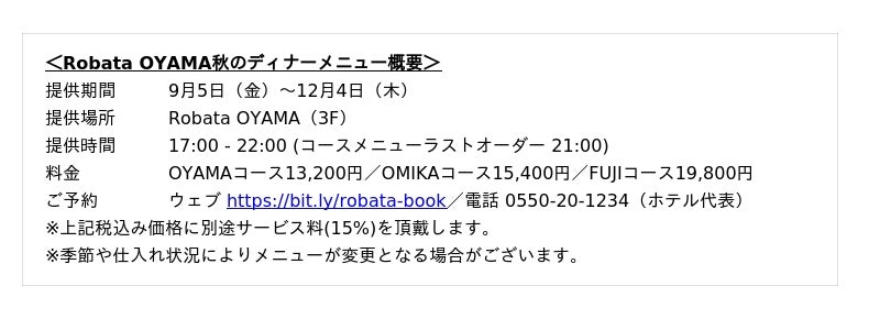 炉端焼きレストラン「Robata OYAMA」では、秋の味覚を存分に楽しめる特別ディナーコースをご用意しております。