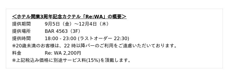 約270台のミニカーがアートとして並ぶユニークな空間が特徴のBAR 4563では、ホテル開業時に誕生したシグネチャーカクテル3種「KYO」「WA」「KA」を、開業3周年の特別な節目に合わせ、新たな視点と技術でリバイバル展開しています。