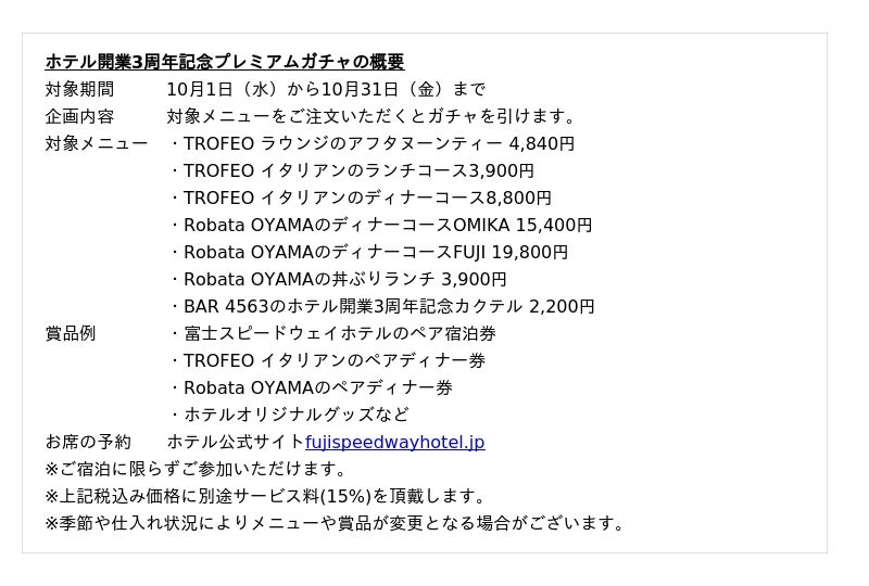 富士スピードウェイホテルは、開業3周年を記念して、10月1日~31日限定の特別ガチャ企画を開催します。対象メニューをご注文いただくことで、誰でもガチャにチャレンジできます。