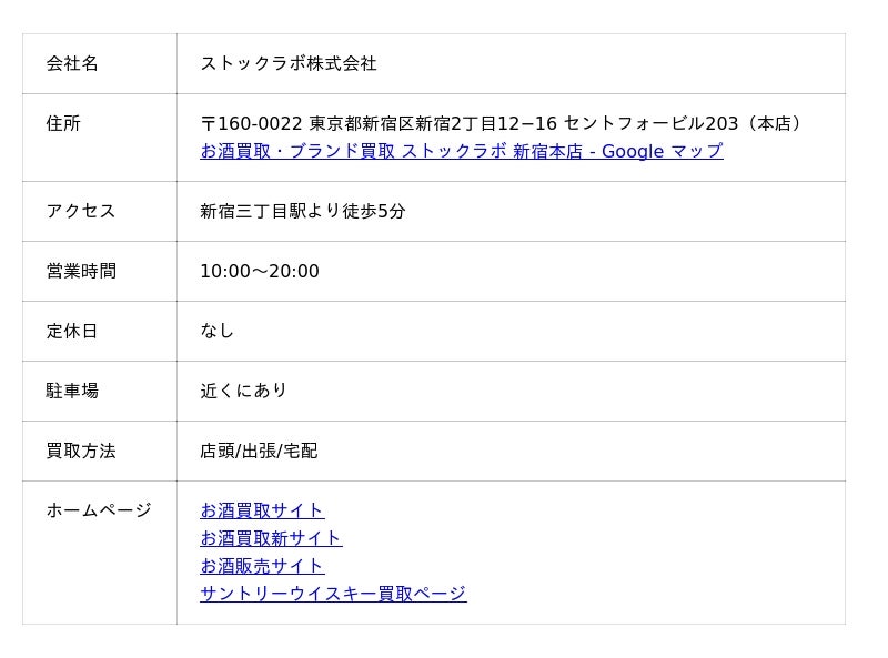 新宿駅や新宿三丁目駅からも程近く、お酒(ウイスキー)やブランド財布、指輪(シルバー)など買取りしてもらいました。他店より査定金額も高く査定してもらい、満足のいく店舗と感じられました。