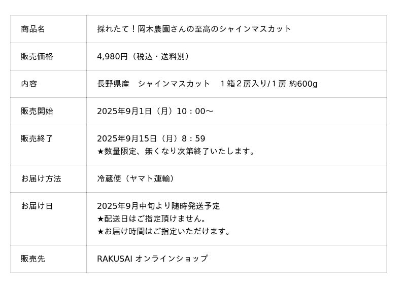 楽彩株式会社(本社:東京都足立区/代表取締役社長:大崎善保)は、長野県にある岡木農園が丹精込めて育てた「至高のシャインマスカット」を、2025年9月1日(月)10:00より公式オンラインショップにて販売開始いたします。