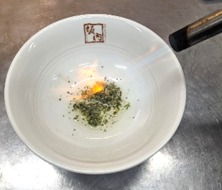 その結果、調達商品部の宮田がこれまでの経験を活かし、パスタ料理「ペペロンチーノ」の辛さをラーメンに取り入れるという斬新なアイデアがひらめきました。味の決め手は、丼に刻んだ青唐辛子と、各店舗で手作りしている焼豚を仕込んだ際にできる“出来立てラード”を入れ、バーナーで1杯ずつ炙って作った、スッキリした辛味ラードです。手作りにこだわり、店内調理で仕上げるからこそ可能な、青唐辛子の風味を活かしたレシピです。
