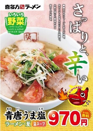 「喜多方(きたかた)ラーメン坂内(ばんない)」をFC事業展開する株式会社麺食(めんしょく)(本社:東京都品川区、代表取締役社長:中原 誠 )は、透明スープなのに激辛の『青(あお)唐(とう)うま塩(じお)ラーメン・夏』(970円・税込)を、2023年6月13日(火)から期間限定で発売します(一部店舗は除外)。