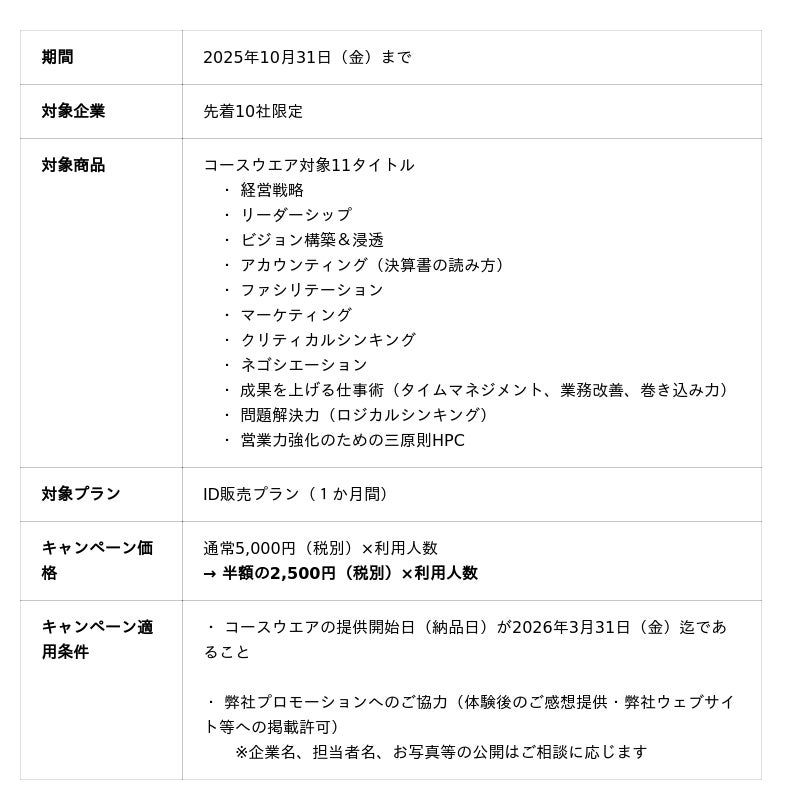 リリースを記念し、先着10社限定で通常価格の半額にてご提供します。経営分析、思考法、仕事術など、ビジネスに直結する全11タイトルが対象です。※モニターキャンペーンとなります。体験後には簡単なご感想をお聞かせください。