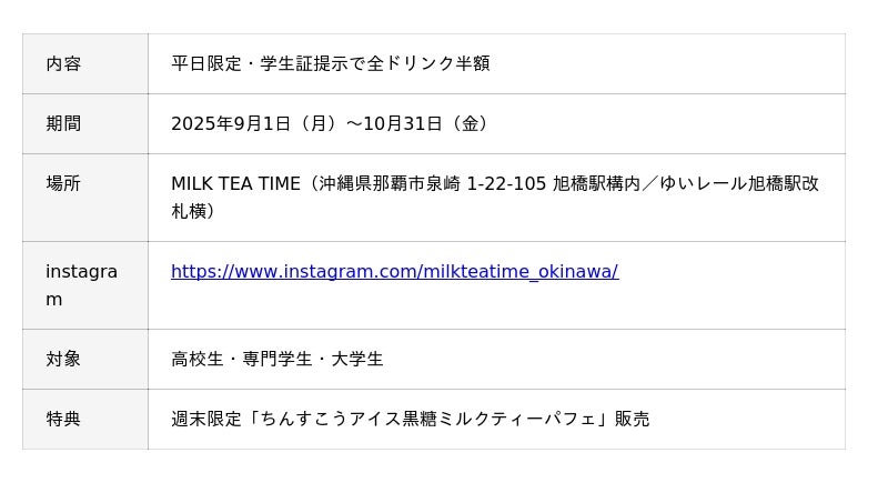 「学生応援の気持ちから始めたキャンペーンですが、観光客の方々にも“沖縄の若者文化”を体験していただけるようにしました。特に週末限定のちんすこうを使ったパフェは、沖縄らしさを気軽に楽しめる一品です。旅先で飲む一杯のミルクティーやパフェを通じて、沖縄の暮らしに少し触れてもらえたらうれしいです」