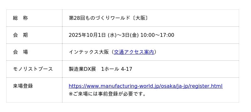 製造業向けAIセールスプラットフォーム 「monolyst(モノリスト)」を提供するmonolyst株式会社(本社:東京都渋谷区、代表取締役:伊関 洋介、以下「当社」)は、2025年10月1日(水)~10月3日(金)にインテックス大阪で開催される「ものづくりワールド大阪 製造業DX展」に出展します。