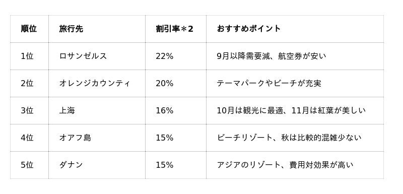 その他にも、4位には日本人から不動の人気を誇る「オアフ島」や、ベトナムのリゾート地「ダナン」、そして「ロンドン」などが入りました。これらの人気旅行先は夏と比べて、秋には15%もお得になります。この秋、ランキングに入っているエリアへの「オフピーク旅」を検討することをおすすめします。