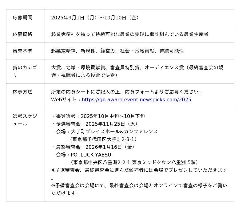 「起業家精神」の観点で農業生産者の優れた取り組みを表彰するものです。リスクを恐れずチャレンジし新しい価値を生み出す行動力や、持続可能な農業を実現する経営力などを重視し、農業の可能性に挑戦する農業生産者にスポットライトを当てます。